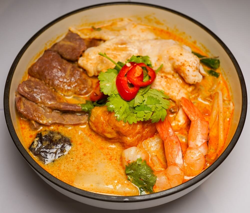 Rich coconut curry broth with noodles, prawns, squid, fish cake and vegetables.