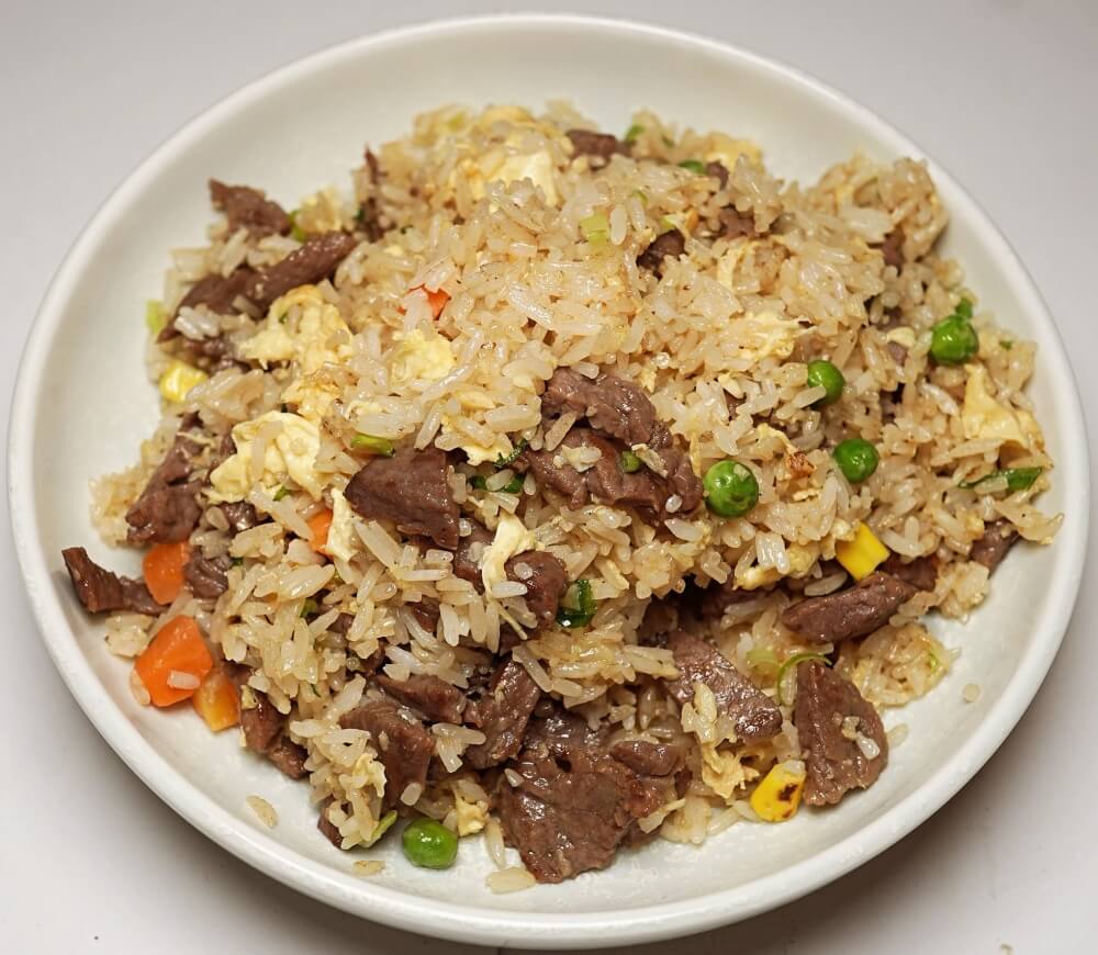 Fragrant curry-spiced fried rice with Chinese sausage, prawns, egg, mixed vegetables and crispy anchovies.